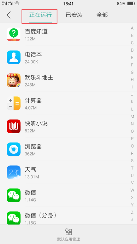 打开[应用程序管理],点击选项卡切换为[正在运行],查看有哪应用在运行