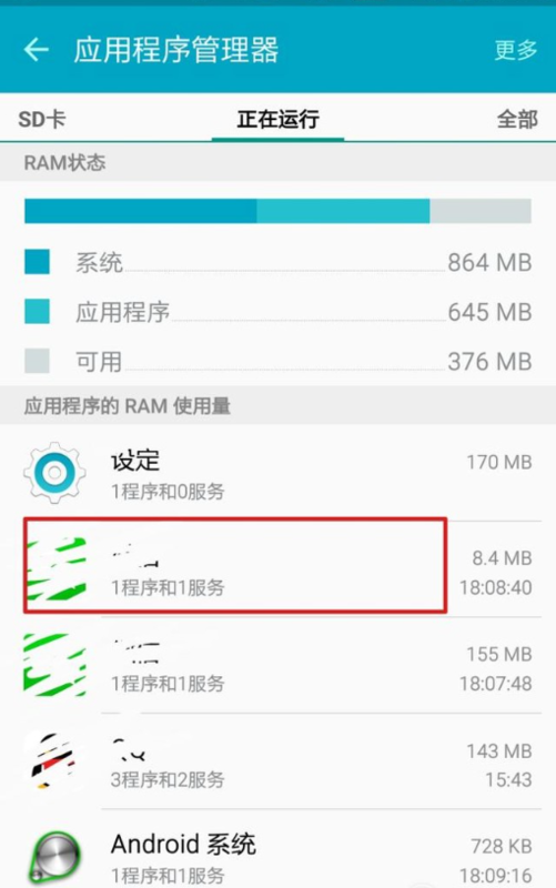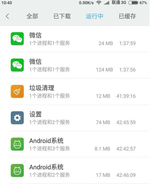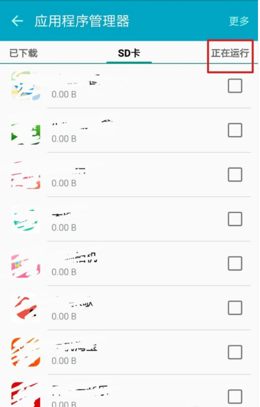 2、进入更多应用后,我们可以看到有全部应用、下载、运行中、下载等选项。我们选择运行中。这里我们可以详细的看到当前所有运行的程序及服务。点击相关应用程序,即可,关闭。