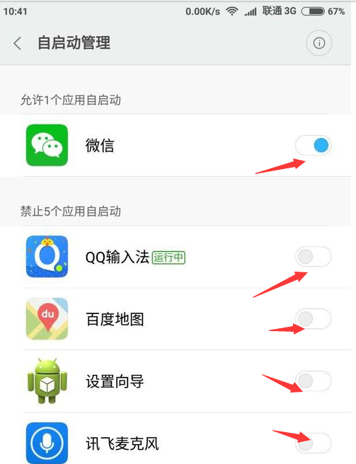 4、然后点击自启动管理,我们可以看到在该界面,可以,控制是否允许应用程序自启。一般来说,微信,QQ,应用需要开启自启动。否则的话容易,无法及时接收到消息。其他程序我们一律选择否即可。