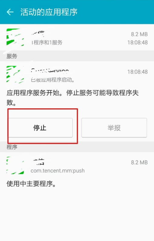 点击进入需要关闭的应用进程,点击下面的[停止],手动强制停止应用运行
