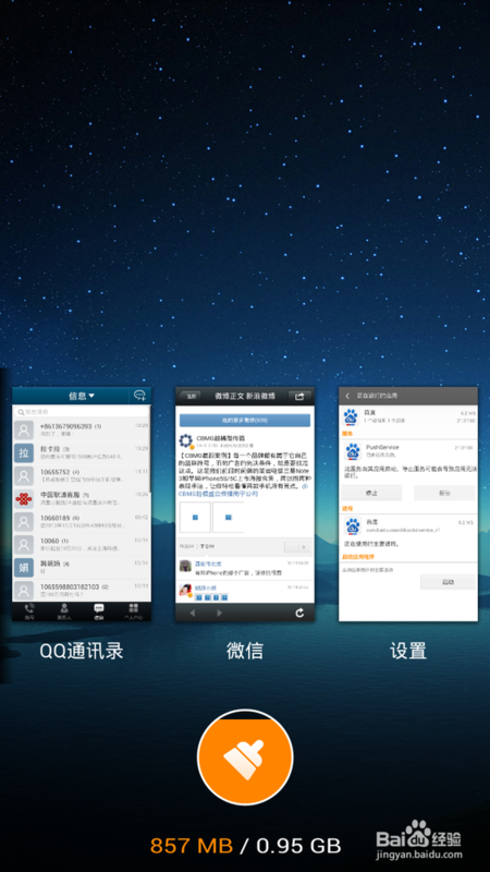 或者就是用手机自带的一键清理功能,也可以实现关闭后台程序的目的: