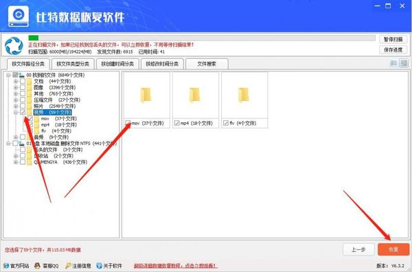 3.确定选择后软件会对磁盘进行扫描,在扫描界面的左侧文件目录中找到要恢复的文件点击勾选,确定选择后点击界面下方的“恢复”