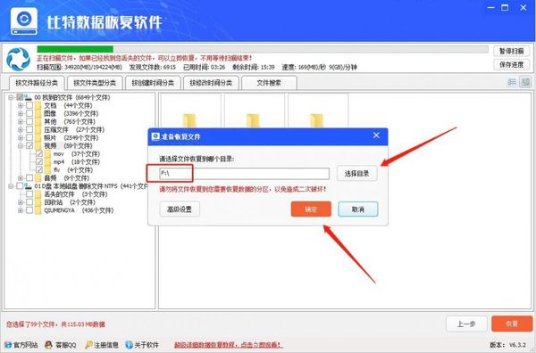 4.点击后在弹出的路径设置框中点击“打开目录”设置文件恢复后的保存路径,设置完成后点击“确定”开始恢复文件