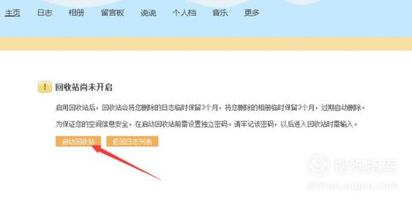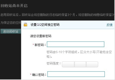 2、如果空间还没有设置密码的朋友,点击“日志”,弹出的页面提示你开启回收站功能,开启回收站后,你删除的邮件,QQ空间将为你保存三个月。或者直接输入你的QQ空间密码。我们点“启动回收站”,弹出对话框要我们设置密码。我们输俩遍后,点确定。但是这密码不能和QQ密码相同。
