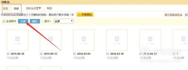 3、设置好后,我们看到我最近三个月删除的照片。如果我们要还原的话,可以勾选照片,进行还原。黄钻用户的话,可以恢复一年之内删除的照片。但前提是你一直续费和开启回收站功能。