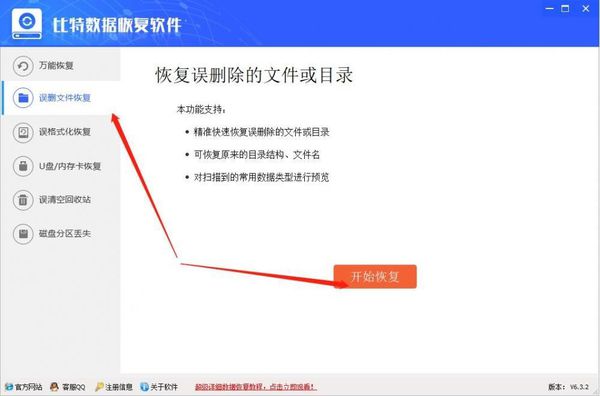 1.首先将比特数据恢复软件下载安装到电脑上,运行软件进入软件界面,在左侧功能选择栏中点击选择“误删文件恢复”,选择好功能后点击右侧的“开始恢复”选项