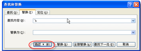 3 选择“替换”点“高级”,在里面选择“使用通配符”以后下面有一个“特殊字符”字的开头,按住shift的时候再点下鼠标,选择空白页,再删除;