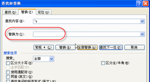 3.在“查找和替换”对话框中单击“替换为”右侧的输入框,单击“全部替换”按钮,如下图: