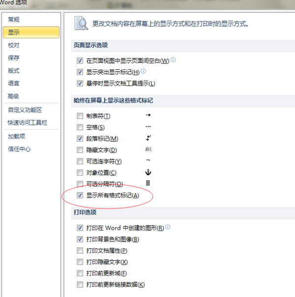 文件——选项——显示,将“显示所有格式标记”打勾。