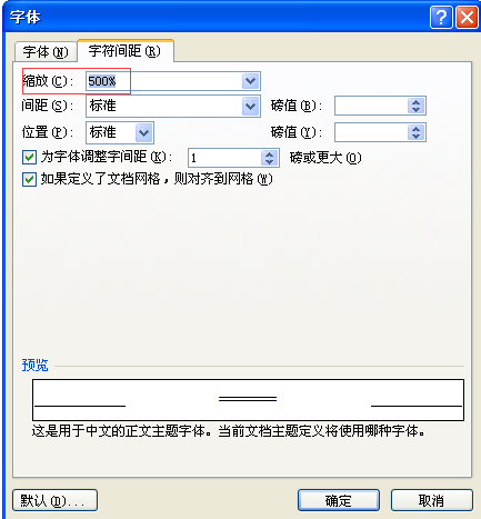 3、弹出字体对话框,选择字符间距选项卡,在缩放处输入500%即可,如图所示;