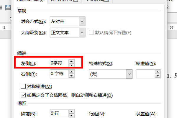 (4)在缩进里面将“左侧”调节为0字符,如下图红框所示;
