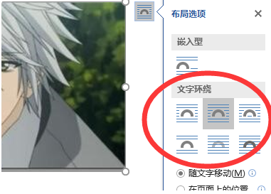 3、然后点击图片,在图片的右上角会出现“布局选项”的图标,在选项中选择“文字环绕”内的任一类型。