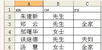 首先启动Excel 2003(其他版本操作类似),在A1单元格中输入xm,B1单元格中输入cw,在A列中输入嘉宾姓名,在B列中输入先生、女士或小姐。输入完成后,保存为“请柬数据.xls”,备用。