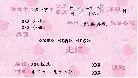 打开“请柬.doc”,执行“工具→信函与邮件→邮件合并”,在右侧的“邮件合并”窗格中,单击“下一步:正在启动文档”,在“选择开始文档”中,使用默认值“使用当前文档”。再单击“下一步:选择收件人”,在“使用现有列表”中选择“浏览”,选择“请柬数据.xls”文件。单击“下一步: 撰写信函”,选择“其他项目”,弹出“插入合并域”窗口,将xm和cw插入到文档的相应位置(插入前请删除刚才输入的嘉宾姓名和称谓)。单击“下 一步:预览信函”,这时,可以看到已经将嘉宾的姓名插入到相应位置。最后单击“完成合并”(在完成合并前,一定要将请柬图片删除掉,不然会将图片一起打印),放入请柬,单击“打印”就可以将请柬打印出来了。