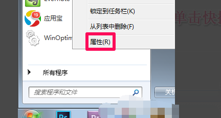 2.或者在开始程序的菜单中右键单击程序图标,然后选择属性。