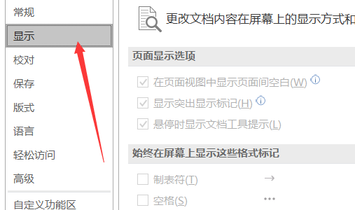 3、这是也会出现Word的选项页面,在第二个选项中找到“显示”,点击一下。