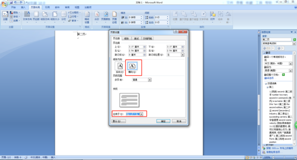 6.点中以后,会出来对应的页面设置,我们首先选中横向,然后再选择最重要的一个设置。就是左下角的那个下拉选项,点中以后可以看到有整篇文档,和所选文字。默认的是整篇文档,这就是为什么我们点击纸张方向按钮时,所有的页面都变成横向的原因。我们这里选择所选文件。