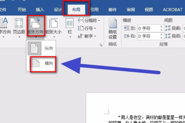 3、点击界面上方的”布局“,点击下一行中的”纸张方向“,点击下拉箭头,选择”横向“。