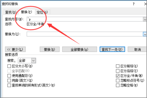 3、切换到替换选项卡,在替换为输入框中输入:^p;