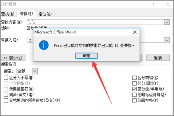 在输入框中会显示为“^p^p”,在“替换为”输入框中用上面的方法插入一个“段落标记”,即“^p”,
