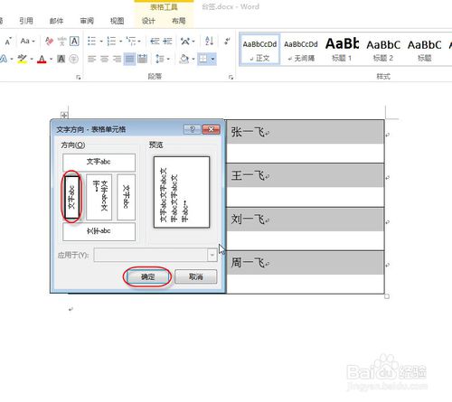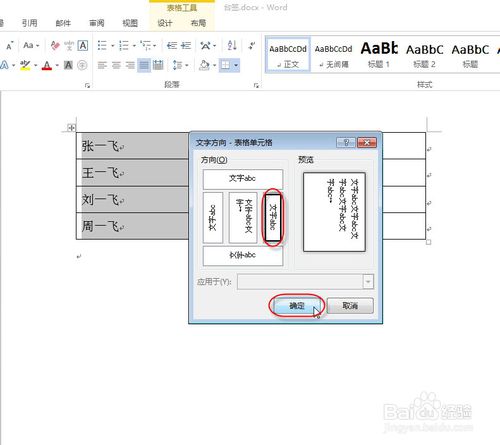 弹出“文字方向-表格单元格”对话框,在“方向”栏中选择第2行第1个选项,单击“确定”按钮。
