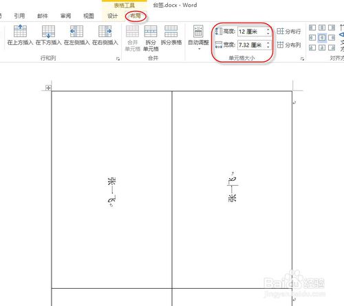 在“单元格”组的“表格行高”数值框中输入“12厘米”,在“表格列宽”数值框中输入“7.32厘米”