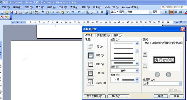 3、在弹出的对话框中,看到右边的应用于选择“文字”;在线型那里,点击选择你要的样式,在“颜色”和“宽度”那里,可以按照要求调整,完成后确定;