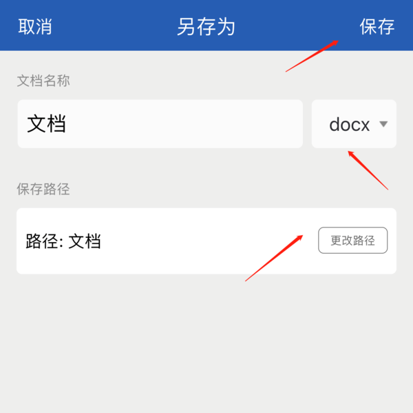 7、将文件类型选择为docx,保存路径根据自己需要进行选择,然后点击右上角的保存就可以将自己编辑的文字制作成word文档进行保存了。