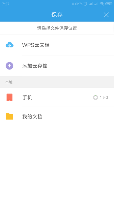 5、手机屏幕将出现以下画面,让你选择文件保存的位置,比如我们选择第一个“我的文档”,如下图中内容所表示。