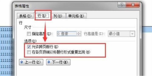 4、在表格属性的行属性中,就可以看到允许跨页断行属性是默认选中的。