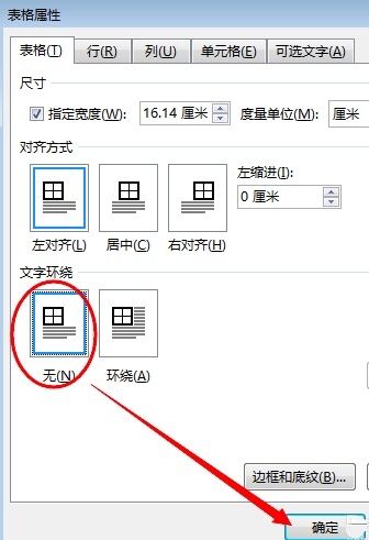 2、在弹出的“表格属性”对话框“表格”标签页下,将“文字环绕”设置为“无”,然后 单击“确定”即可。