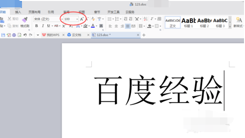 4、选中百度经验四个字,然后按A+,按一下,大一点,直到你想要的大小字体效果就可以,这个时候我们可以原来显示初号那个地方变成了数字100,也就是说现在的字号已经到了100号,如下图