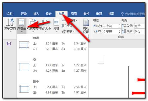 1、首先打开word文档,点击上方菜单栏的“布局”,然后选择“页边距”点击“自定义边距”。
