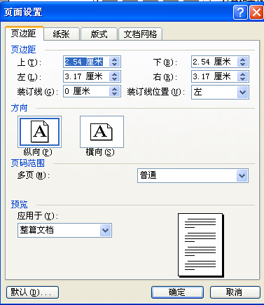 纵向页面,上下页边距各为2.54cm;左右页边距各为3.17cm