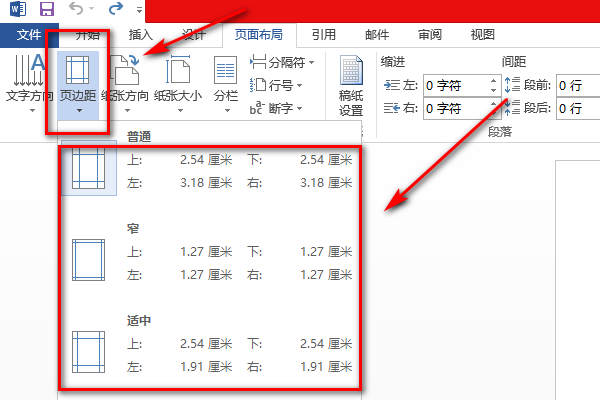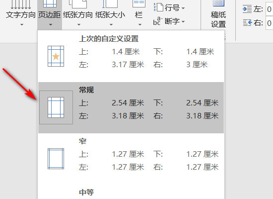 4.在弹出的菜单中可以选择自己需要的页边距;
