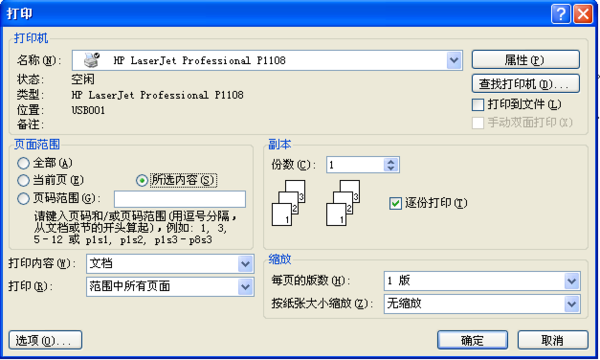 2、弹出打印对话框,在页面范围处单击所选内容单选按钮即可,如图所示。