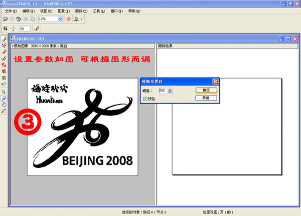 第一种:完整安装Coreldraw(以下简称CD)会自带一个附件——Corel Power TRACE(以下简称CT),在CD中可以直接点击应用程序按纽调用CT。CT的使用比较简单,导入位图后,设置一下边界,点转换即可,一次不成再调整再转换,不过CT对于块面化的位图比较适合,对于复杂的位图就不是很好了,转换了也不是我们想要的结果。