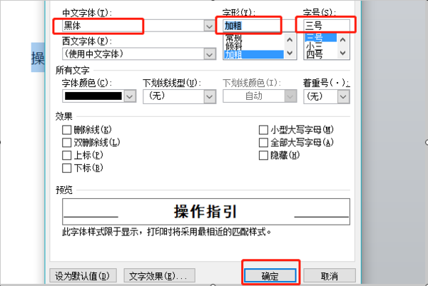 2、在弹出的字体设置框里,中文字体选择“黑体”,字形选择“加粗”,字号选择“三号”,最后点击下面的确定;