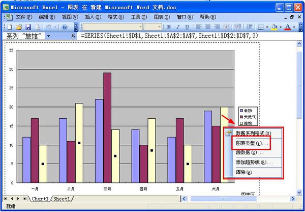 Word2003中的操作方法:插入 → 图片 → 图表;这样默认插入的是“柱形图”,可以鼠标右键单击柱形图中的“柱”,然后选择“图表类型”,即可选择所需要的图表了。