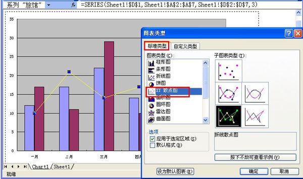 3、右键点柱状图,修改“图表类型”。分别把几个柱状图改成XY散点图。