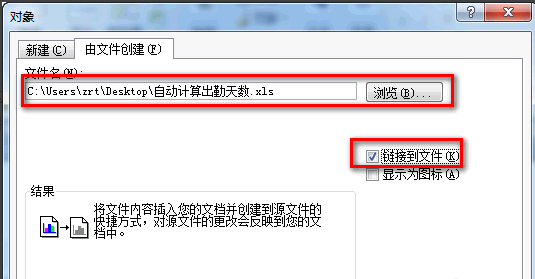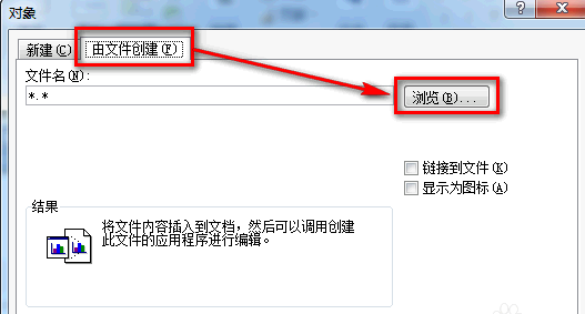 2、选择【由文件中创建】并点击浏览要插入的Excel文件。