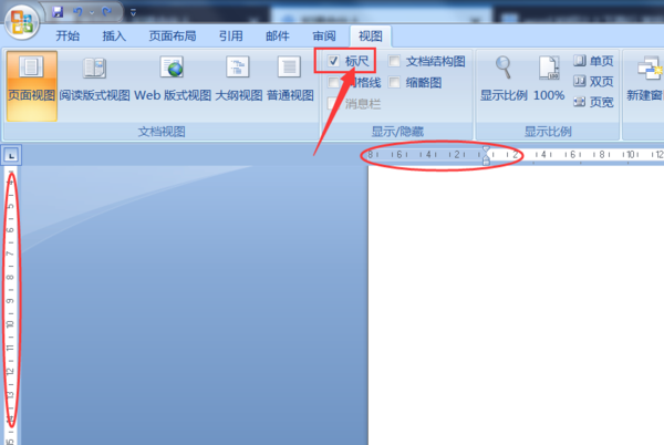 2、点击“标尺”,调出标尺,此时可以看到Word编辑区左右两边各多出一条标尺。
