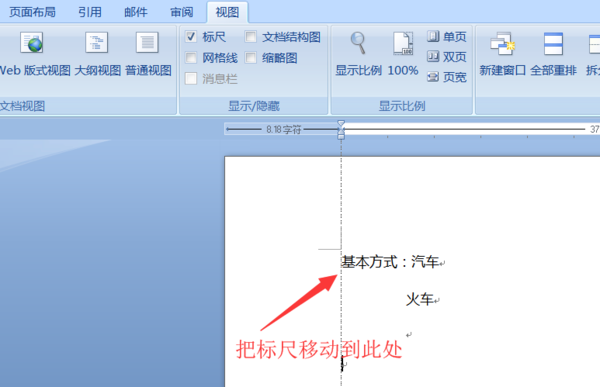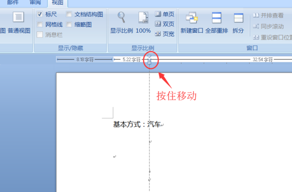 4、鼠标移动到上方标尺的箭头处,按住左键不放移动到想要对齐的地方再松开鼠标。