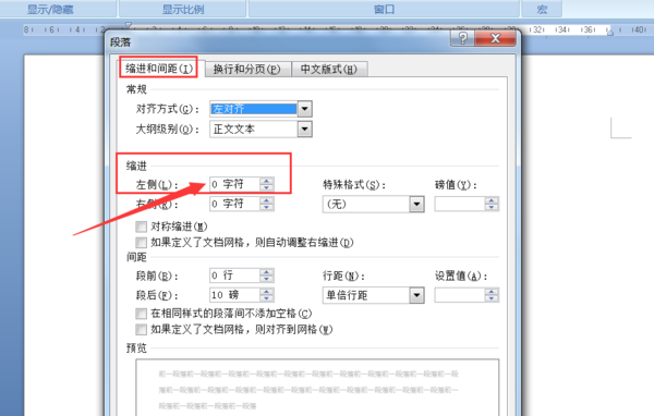 4、要重新对齐第一个字开始写入的话重复以上步骤,在“左侧缩进”后输入“0”然后确定就行了。