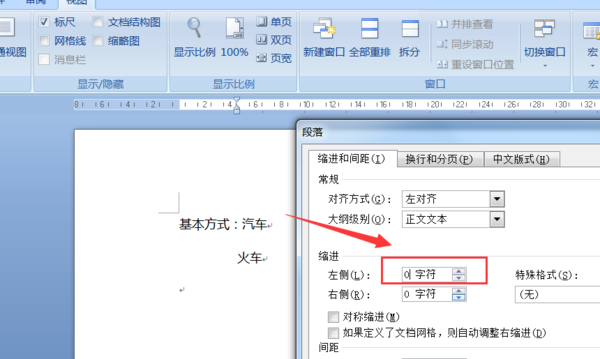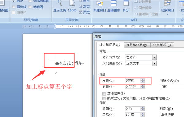 3、然后输入要缩进的字数:比如要对齐“汽车”那就数一下在汽车前有几个字,一个标点符号算一个字。输入之后单击确定关闭窗口即可。