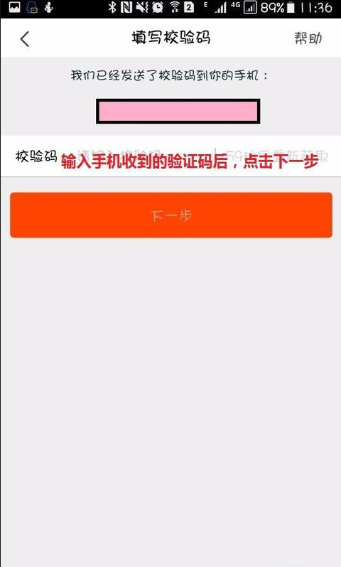 第五步、输入短信接收到的验证码后,再次点击“下一步”。