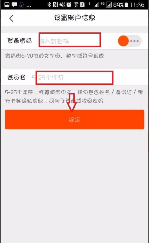 5、然后进入账户的信息页面,在这个页面中设置自己的登录密码和会员名称,输入完成后,点击确定,完成注册。(用户名不可更改,只能注册一次,并且不能重复,如果重复,系统会提示重复,需要重新输入)