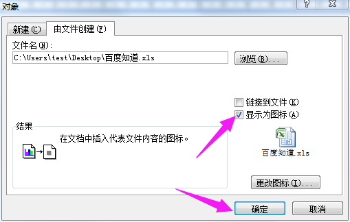 3、插入后,勾选“显示为图标”--确定。(注意,如果点击链接到文件,以后更改会影响原文档内容)
