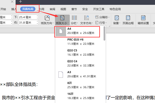 2、点击标题栏的“页面布局”按钮,然后在下方找到点击“纸张大小”,此时会弹出下拉选框,选择“A4”。
