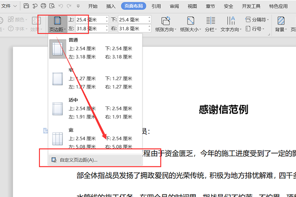 3、最后需要调整页边距,点击“页边距”,在下拉菜单中选择“自定义页边距”。